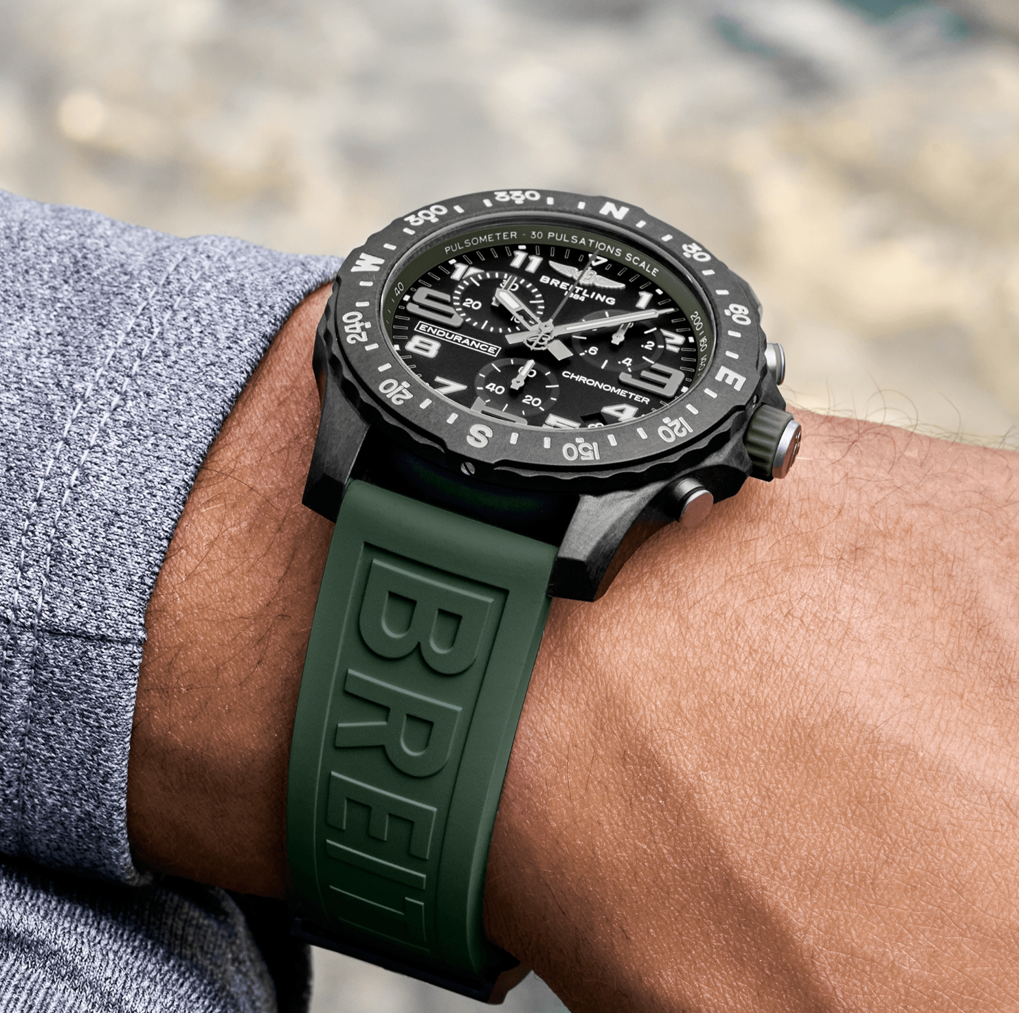 Designed to be both a lightweight watch for athletes and a casual, everyday sports chronograph, the Endurance Pro perfectly blends high precision & innovative technology with a vibrant & colorful design. It is the ultimate athleisure watch. Designed for men and women whose active lives blend a professional mindset with a sporty lifestyle, the Endurance Pro is equal to the challenges of a rigorous workout but fashionable enough for everyday wear. The Endurance Pro features an ultra-light Breitlight® case, a robust material 3.3 times lighter than titanium and 5.8 times lighter than stainless steel. Non-magnetic, thermally stable and hypoallergenic, Breitlight® is highly resistant to scratches, traction and corrosion. It also has a touch that is warmer than metal and a slightly textured effect accentuating the originality of the design. Exclusive to Breitling, it is 100% Swiss-made. Offered with a set of colorful dial and rubber straps fitting a Breitlight® double tang-type buckle, the Endurance Pro can also be paired with one of Breitling’s colorful Outerknown ECONYL® yarn single-piece strap. Powering the Endurance Pro is Breitling’s Caliber 82, a COSC-certified SuperQuartz™ chronograph delivering exceptional precision.
