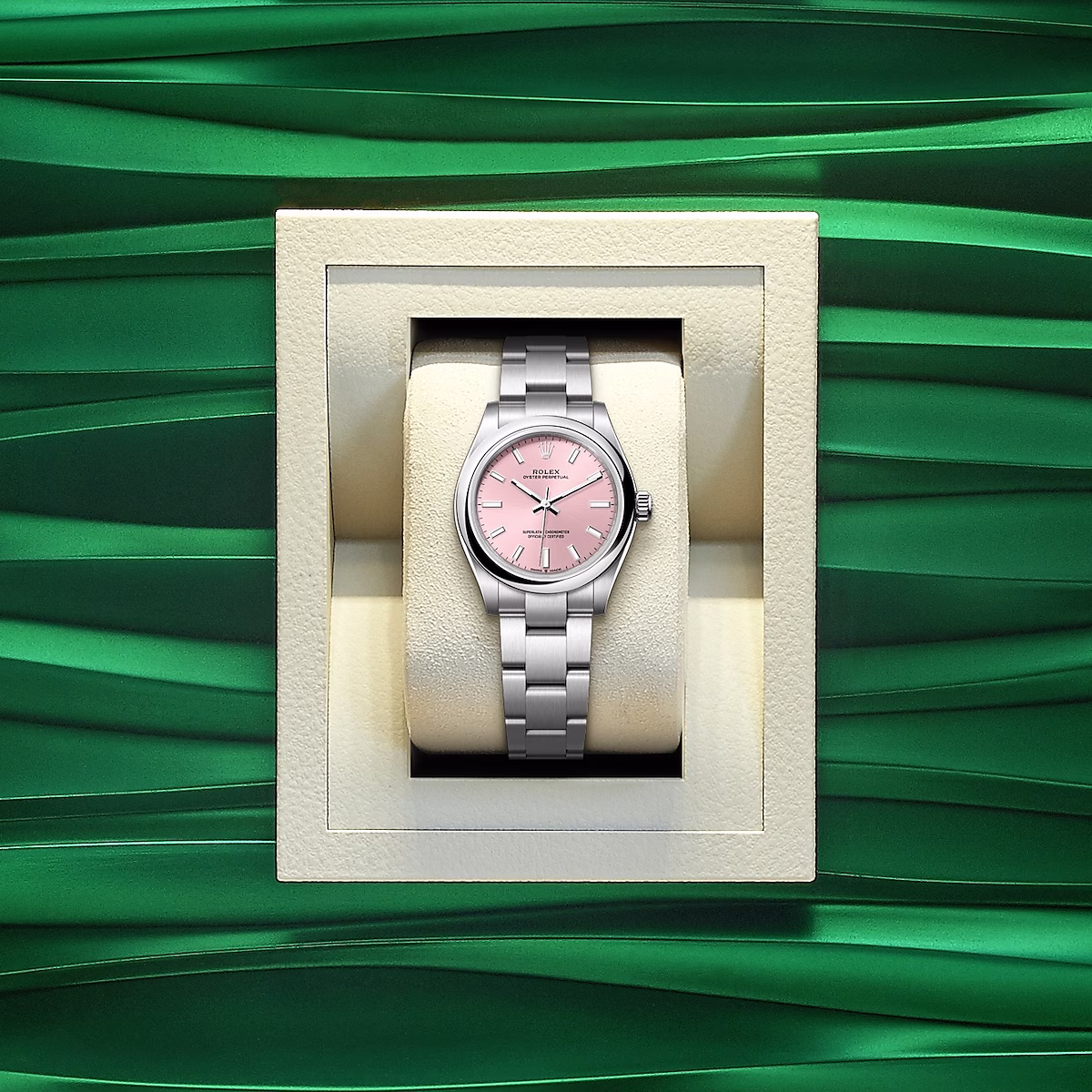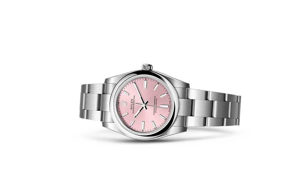 Many of the dial styles in the Oyster collection feature sunray effects that reflect an elegant sheen. This effect requires excellent brushing techniques to create engravings that expand from the center of the dial outwards.